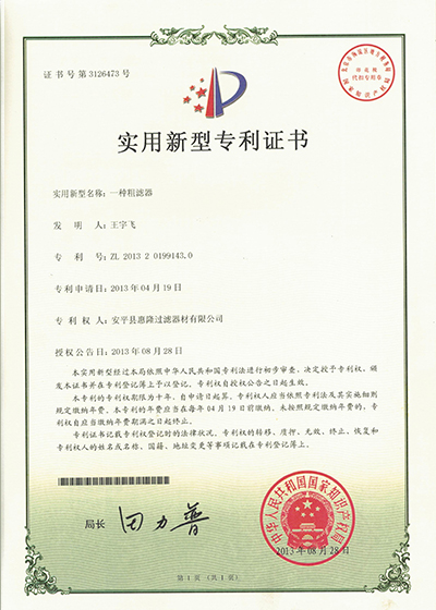 上一篇:實用新型專利證書(吸回油過濾器)